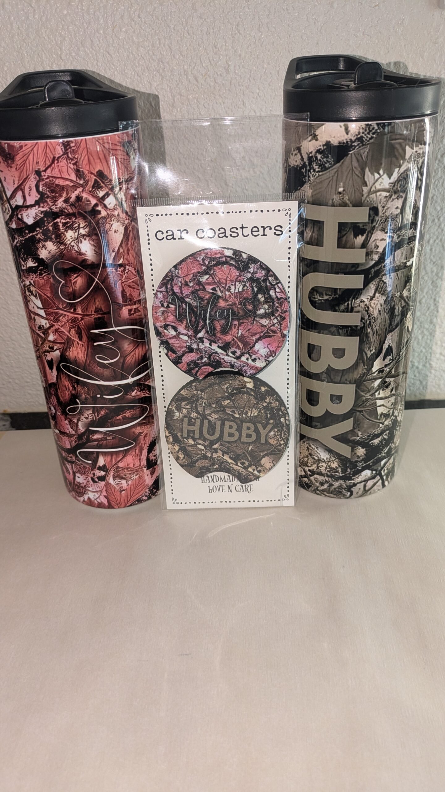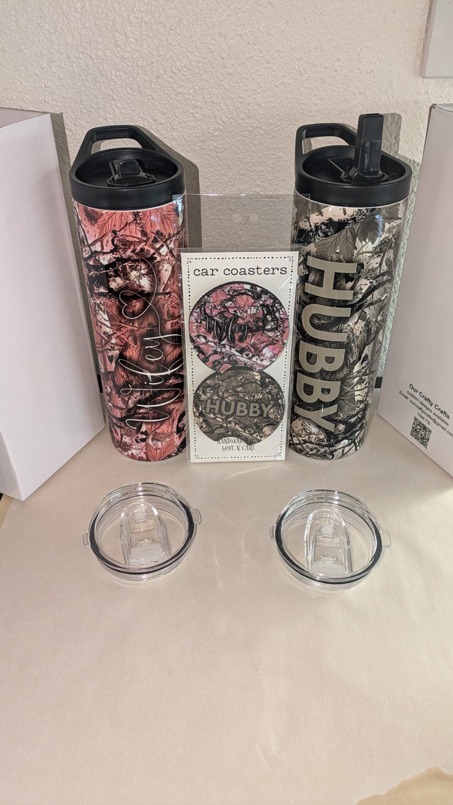 Celebrate your love with this charming two 20 oz tumbler set designed for couples. Each tumbler features a unique dual lid system—screw top for secure sealing and push-on for easy sipping—making them perfect for both cozy nights at home and adventurous outings. The set also includes two stylish car coasters, all beautifully sublimated with the affectionate titles ‘Wifey’ and ‘Hubby’. Whether it’s a picnic or a road trip, this tumbler set is a delightful way to keep your drinks hot or cold while showcasing your bond.